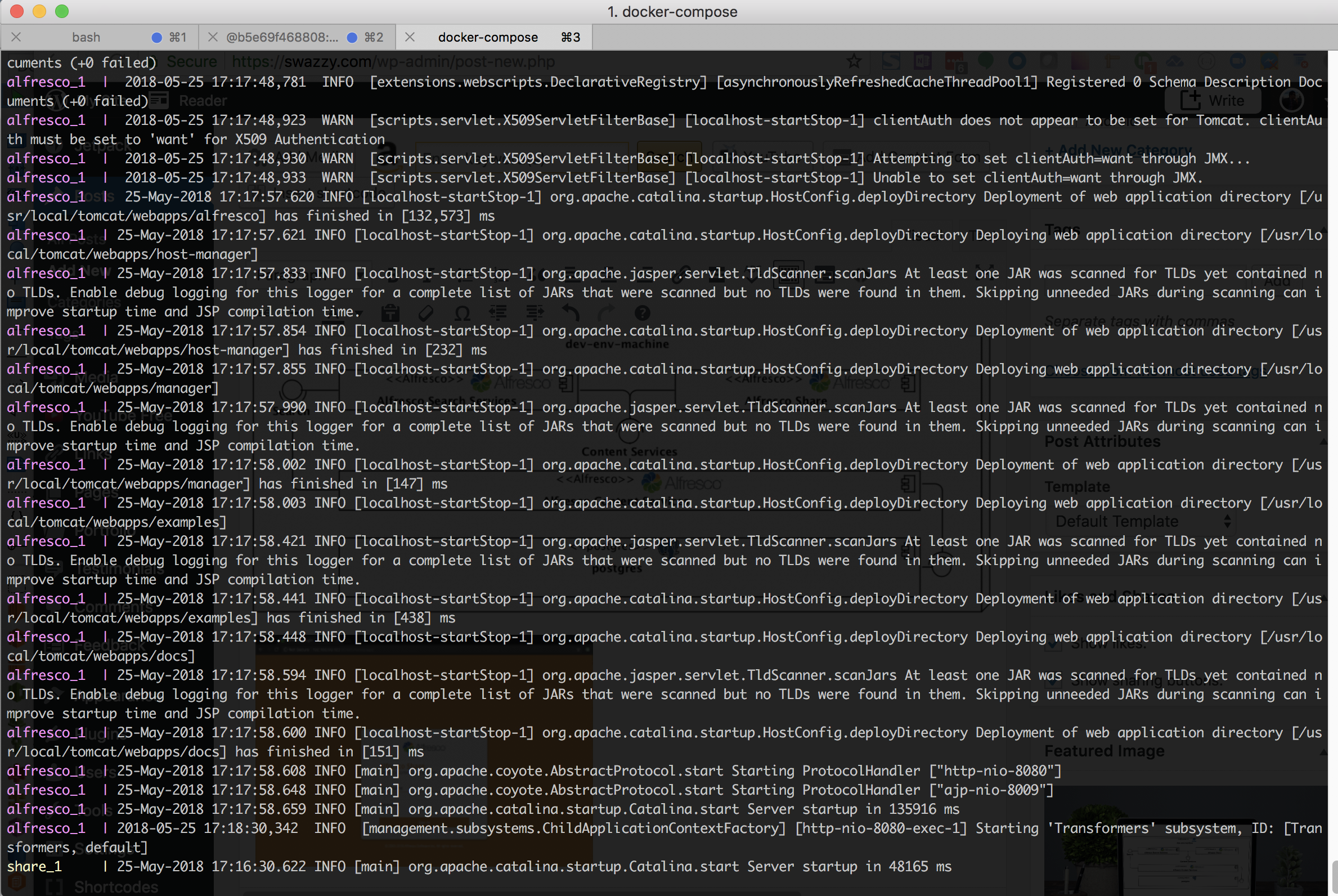 # log into repository container docker run -it alfresco/alfresco-content-repository-community:6.0.5-ea bash # log into share container docker run -it alfresco/alfresco-share:6.0.a bash # log into postgres container docker run -it postgres:10.1 bash # log into search container docker run -it alfresco/alfresco-search-services:1.1.1 bash ## ## or log into running instances # First list the container ids docker ps # Then get a bash shell for the running container you wish to inspect docker exec -it CONTAINER_ID /bin/bash #### EXAMPLE alex@mbp:~/workspaces/containers/acs-community-deployment/docker-compose$ docker ps CONTAINER ID IMAGE COMMAND CREATED STATUS PORTS NAMES 055d595c2006 alfresco/alfresco-content-repository-community:6.0.5-ea "catalina.sh run" 3 hours ago Up 3 hours 0.0.0.0:8082->8080/tcp dockercompose_alfresco_1 1ef0957b1ded alfresco/alfresco-share:6.0.a "/usr/local/tomcat/s…" 3 hours ago Up 3 hours 0.0.0.0:8080->8080/tcp dockercompose_share_1 a1c49ab0d9a0 alfresco/alfresco-search-services:1.1.1 "/opt/alfresco-searc…" 3 hours ago Up 3 hours 0.0.0.0:8083->8983/tcp dockercompose_solr6_1 179ca4c51734 postgres:10.1 "docker-entrypoint.s…" 3 hours ago Up 3 hours 0.0.0.0:5432->5432/tcp dockercompose_postgres_1 alex@mbp:~/workspaces/containers/acs-community-deployment/docker-compose$ docker exec -it 055d595c2006 /bin/bash