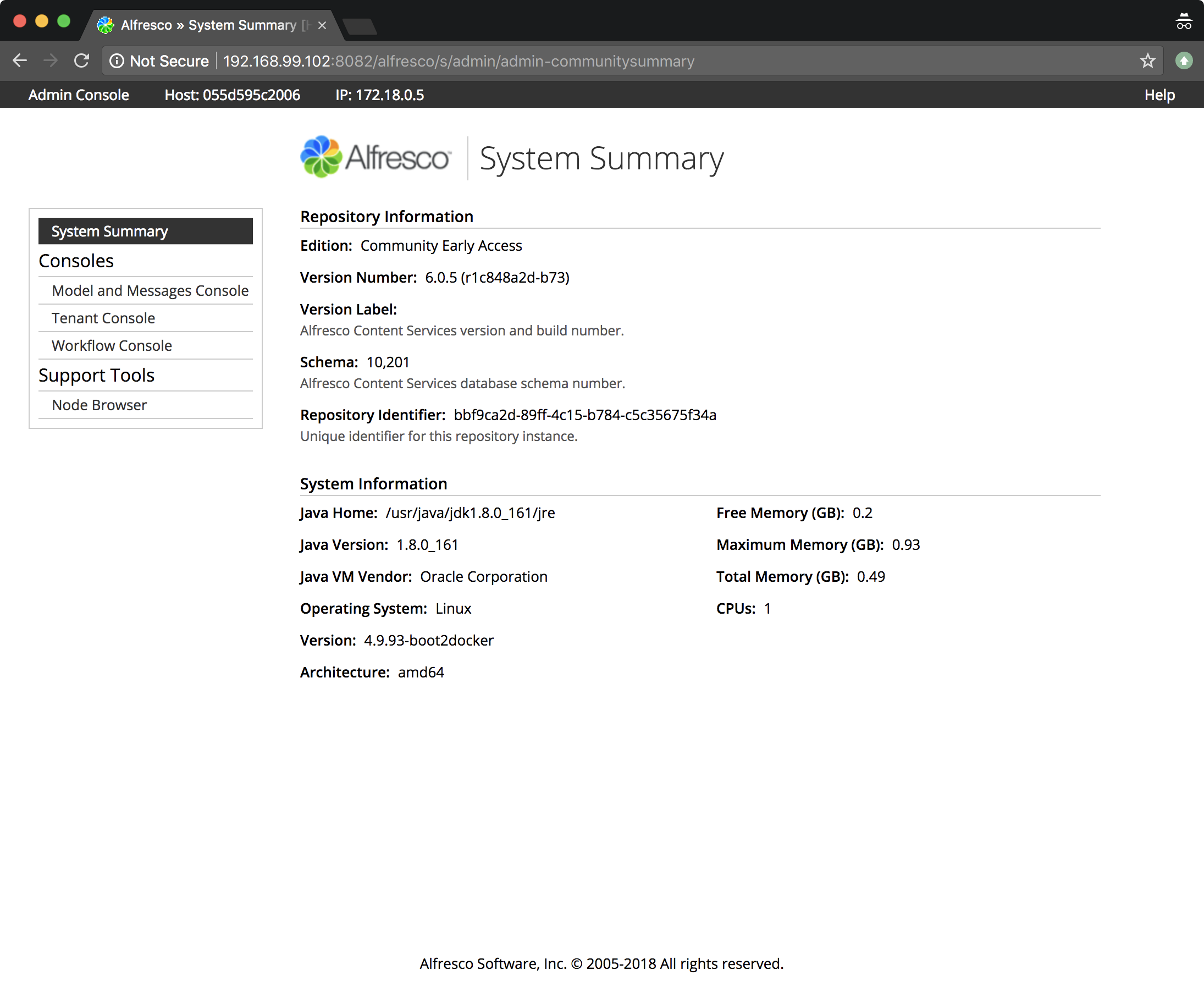 Alfresco Repository: http://DOCKER_HOST_IP:8082/alfresco