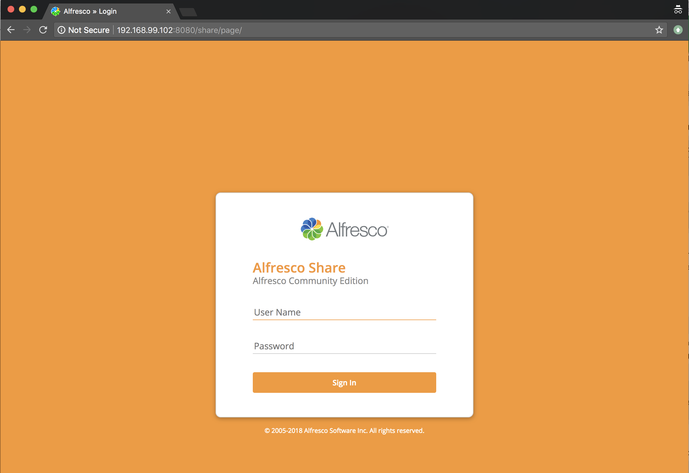 Alfresco Share: http://DOCKER_HOST_IP:8080/share