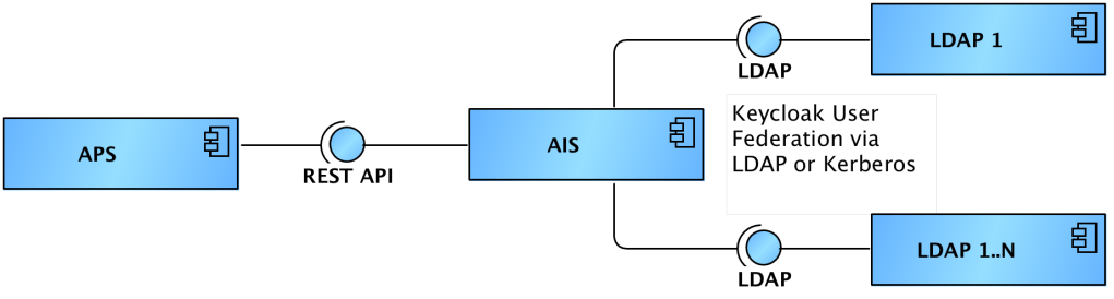 In a multi-domain environment, where connecting to multiple domains are not supported by the application, this may be handled by dedicated Identity Management Services such as Microsoft Identity Manager, Forgerock Identity Management, Okta Multi-Domain and provisioning feature; ETL services like Talend Open Studio with LDAP connectors, EAI utilities like Apache Camel, Spring Integration with Spring LDAP, or MuleSoft, etc.; or a directory passthrough/aggregation as described in this article: https://ltb-project.org/documentation/general/sasl_delegation. However, since APS provides the extension points to support authority provisioning, we will leverage that in this example, to synchronize users from AIS into APS via Keycloak’s REST API.