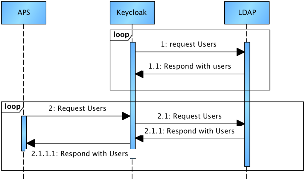 An extension module in APS is executed via Quartz Cron settings, to poll the Keycloak REST Admin API for users, then add those users into the APS directory. Because Keycloak does not support querying via last-modify, or last-created, it is not possible to ask keycloak for a subset of users. Instead, we take all users, and eliminate the users that were already synchronized, based on created timestamp stored in Actitivi.